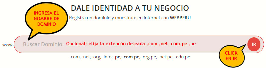 - En nuestra página principal podrás colocar el nombre que deseas y la terminación de dominio correspondiente en el cuadro de búsqueda, y luego clic en el botón Ir