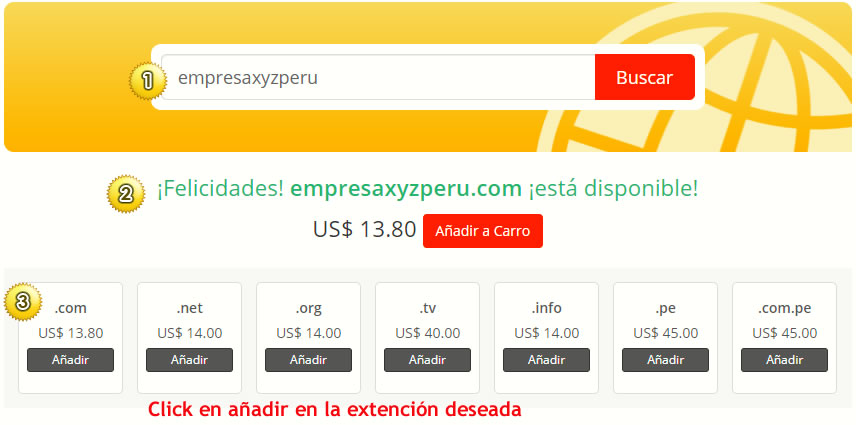 - Verificación de dominios: En este campo de texto puedes escribir el nombre que deseas, luego elija la extención y hacer clic en el botón buscar.